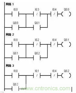 2. 單向順序停止控制電路就是要求按一定順序停止已經執行的各機構。只有Q0.2被停止后才可以停止Q0.1,若想停止Q0.0,則必須先停止Q0.1。I0.4為急停按鈕。