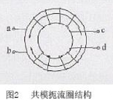 圖1 是開關電源EMI 濾波器的電路。其中L1、L2為共模扼流圈,其結構見圖2。由于它的兩個線圈匝數相等,這兩個電感對于差模電流和主電流所產生的磁通是方向相反、互相抵消的,因而不起作用;而對于共模干擾信號,能夠得到一個大的電感量呈現高阻抗,以獲得最大的濾波效果,因此對其有良好的抑制作用。但是,由于種種原因,如磁環的材料不可能做到絕對均勻,兩個線圈的繞制也不可能完全對稱等,使得L1和L2的電感量是不相等的,于是,(L1- L2)形成差模電感,它和L3與L4形成的獨立差模抑制電感與Cx電容器又組成L - N 獨立端口間的一個低通濾波器,用來抑制電源線上存在的差模干擾信號。