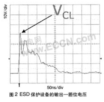 圖2所示的是一次ESD事件中,ESD保護設備的輸出(箝位電壓)。