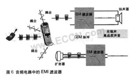 在音頻電路中如有電磁干擾(EMI),會出現嘶嘶、噼啪、嗡嗡等聲音,聲音質量很差。手機用戶無法忍受這樣的干擾。因此,必須設法過濾音頻電路的電磁干擾。