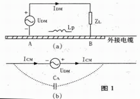 圖1是電流驅動模式的示意圖。圖1(a)中UDM是差模電壓源,設備內部有很多這樣的源,例如各種數字信號電路、高頻振蕩源等等,ZL為回路負載,IDM為回路負載的差模電流,該電流流過AB兩點間的回流地(例如印制板的地線),回到差模源。如AB間存在一定的電感LP,則產生壓降為