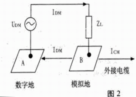 例1:在印制電路板上為了把數字部分和模擬部分隔離,常把地分割成數字地和模擬地。如果這兩部分之間有信號聯系,如圖2所示,并且數字地和模擬地的連接部分AB比較細長,存在一定電感,則差模電流IDM將在AB連接線的電感上產生共模驅動電壓源,從而引起共模輻射,天線一部分是數字地,另一部分是模擬地和外接地線。