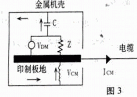 例2:印制電路板的地通過接地導線與機殼相連,如圖3所示。印制板上有信號線與機殼貼近,于是差模源VDM通過分布電容C耦合到機殼上,引起差模電流,該電流通過機殼和接地線又回到印制板的差模源。如果接地線存在一定的電感L,則差模電流在L上產生電壓降VCM,成為共模驅動電壓,從而引起共模輻射。這時天線的一部分是外接地線,另一部分是機殼。這種輻射常發生在以下情況,例如設備內部的地址線、數據線等扁平電纜貼近機殼,分布電容較大,印制板和機殼之間的連接線細長或接觸不良等等。
