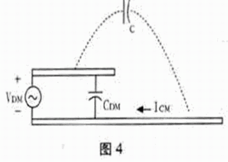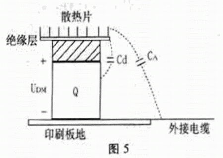 圖5是電壓驅動模式的一個實例。圖中Q是大功率的開關管,Q可看成是差模電壓源UDM,共模電流ICM的途徑是由Q通過開關管和散熱片之間的分布電容Cd到達散熱片,散熱片是共模天線的一個極。然后以空間位移電流的形式,即通過C A到達外部接線,外部接線是天線的另一個極,共模電流再由印制板地回到Q。