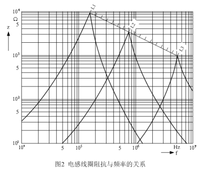 圖2是普通電感線圈的阻抗與頻率的關(guān)系圖,由圖中可以看出,電感線圈的阻抗開始的時(shí)候是隨著頻率升高而增大的,但當(dāng)它的阻抗增大到最大值以后,阻抗反而隨著頻率升高而迅速下降,這是因?yàn)椴⒙?lián)分布電容的作用。當(dāng)阻抗增到最大值的地方,就是電感線圈的分布電容與等效電感產(chǎn)生并聯(lián)諧振的地方。圖中,L1 > L2 > L3,由此可知電感線圈的電感量越大,其諧振頻率就越低。從圖2中可以看出,如果要對(duì)頻率為1MHz的干擾信號(hào)進(jìn)行抑制,選用L1倒不如選用L3,因?yàn)長(zhǎng)3的電感量要比L1小十幾倍,因此L3的成本也要比L1低很多。