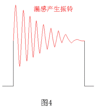 由于變壓器的初級有漏感,當電源開關管V1由飽和導通到截止關斷時會產生反電動勢,反電動勢又會對變壓器初級線圈的分布電容進行充放電,從而產生阻尼振蕩,即產生振鈴,如圖4所示。變壓器初級漏感產生反電動勢的電壓幅度一般都很高,其能量也很大,如不采取保護措施,反電動勢一般都會把電源開關管擊穿,同時反電動勢產生的阻尼振蕩還會產生很強的電磁輻射,不但對機器本身造成嚴重干擾,對機器周邊環境也會產生嚴重的電磁干擾。