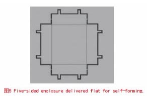 當(dāng)測試后才進(jìn)行腔體安裝,或PCB板的產(chǎn)量很大時(shí),選擇五面腔體更節(jié)省成本。這種選擇能通過焊接管腳,點(diǎn)焊角或?qū)附菍?shí)現(xiàn),也可通過熱回流孔完成加工安裝。迄今為止開發(fā)五面腔體和進(jìn)行少量生產(chǎn)最省錢的方法是選用曲線加工五面腔體。如圖5所示,它是通過在平板上加標(biāo)識完成。當(dāng)將它們安裝在PCB板上時(shí),用戶只需將其折疊成想要的形狀即可。