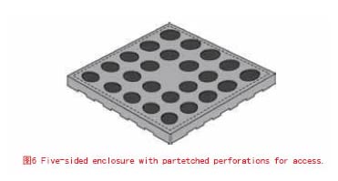 有的設(shè)計(jì)者更喜歡用表面安裝生產(chǎn)線的貼裝設(shè)備將蓋子和圍欄合為整體。只有在重新加工腔體內(nèi)元件時(shí)才打開蓋子。選擇這種設(shè)計(jì)意味著蓋子上必須留有陣列小孔,以便熱量能進(jìn)入腔體將內(nèi)部的電子元件焊接在PCB上,如圖4所示。不幸的是,這些小孔會(huì)將腔體的屏蔽性能降低20dB左右。