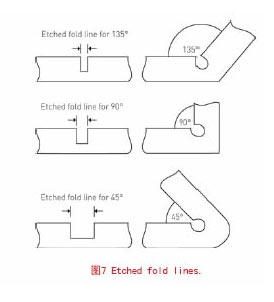 PCM有一些優(yōu)點(diǎn),加工和工具修改花費(fèi)較低,整個(gè)過程所需要的時(shí)間較短。彎線可以被很精確的蝕刻出來,例如,135,90或者45度,如圖7。整個(gè)過程沒有毛邊和金屬應(yīng)力,磁和其他金屬特性不變。可以很方便的用于復(fù)雜的設(shè)計(jì),產(chǎn)品有縫,軌道限界孔,徽標(biāo)和其他細(xì)節(jié)不會(huì)增加最后的費(fèi)用,這可以使設(shè)計(jì)者隨意設(shè)計(jì)他們想要的東西。