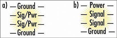 [page]第一種為首選方案,PCB的外層均為地層,中間兩層均為信號(hào)/電源層。信號(hào)層上的電源用寬線走線,這可使電源電流的路徑阻抗低,且信號(hào)微帶路徑的阻抗也低。從EMI控制的角度看,這是現(xiàn)有的最佳4層PCB結(jié)構(gòu)。