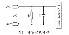 為防止控制板電路產生的傳導干擾,可在電路的進人口(即AC兩端)并接上一個電容C,圖1所示是一個簡單的電容抗擾電路連接圖。圖中的電容屬于安全電容,但必須在該電容的兩端并聯一個安全電阻,以用于防止電源線拔插時電源線插頭長時間帶電。因為安全標準規定,當正在工作之中的機器電源線被拔掉時,在兩秒鐘內,電源線插頭兩端所帶的電壓(或對地電位)必須小于原來電壓的30%。
