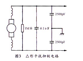 此外,還有一組典型的△形干擾抑制器電路,可同時抑制對稱和不對稱干擾。其具體電路如圖3所示。