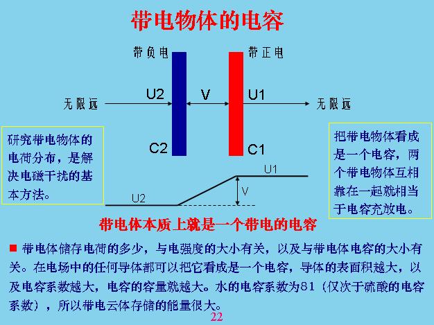 我們給大家介紹一個很重要的概念,就是電容。這個電容和我們現(xiàn)在電路里面用的電容是兩個概念,大家不要混淆。任何帶電體我們都可以把它看成一個電容,電容的大小跟它帶的電壓和電荷的多少有關(guān),如果帶的電荷越多,電壓越高它的電流就越大。電容的概念其實與電荷的概念也是互相對應(yīng)的,我們把這個電容器看成是兩個電容進(jìn)行串聯(lián),也就是說帶電體帶正電,帶正電是對于無限遠(yuǎn)的地方來說的,為什么呢?因為這個帶電以后電場分布是發(fā)散性的,中間這一點(diǎn)是最強(qiáng),離的越遠(yuǎn)的時候電感強(qiáng)度就越來越低,當(dāng)無限遠(yuǎn)的時候就等于零,你不能拿它來參考地球,參考地球的話相當(dāng)于范圍太小,本身地球也可以看成電容,所以分析電容的時候最好用無限遠(yuǎn)的地方作為參考點(diǎn)。也就是說我們計算電容的時候以無限遠(yuǎn)的地方考慮,計算電容也是以無限遠(yuǎn)的地方考慮。把這兩個電容靠在一起的時候就變成了電容器,你就可以利用這兩個電容的電位梯度和電容器來分析。任何一個帶電體都可以看成一個電容,一個孤立球?qū)w的電容等于表面積除以半徑,再乘以電容系數(shù)。地球的容量算出來就是7×10-4(F),把兩個孤立電容進(jìn)行推導(dǎo),算出來就是這樣,電容器正好等于上面儲存的電容量除以電位差。明白電容的概念以后,也要分析電路的電磁感應(yīng)方面,要有量的概念。有了量的概念我們可以對電磁干擾進(jìn)行分析,比如說這邊是一個干擾電壓,通過這條電路進(jìn)行供電,旁邊也有一個電路,這個電路就會受到干擾,干擾怎么計算?它的導(dǎo)向電路是什么?我們可以把兩個導(dǎo)線看成一個電容器,就是有一個耦合電容。等效電路相當(dāng)于這邊,你要減少兩個回路互相干擾的程度就必須要減少上面的Cm電容,把兩條線隔得越遠(yuǎn)越好,而且越短越好,只要面積越小電容器越小,離得越遠(yuǎn)電容器也越小。