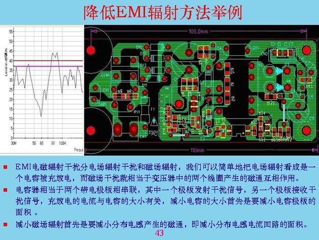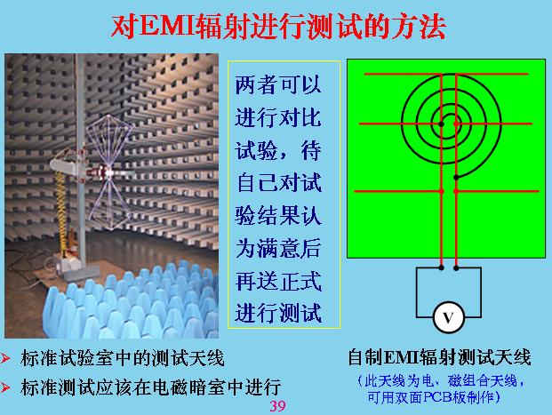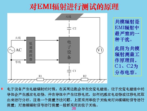 另外對于輻射干擾,我們最注意的就是共模干擾,差模干擾相對來說比共模干擾小很多,我們做過一個試驗,在同一個導(dǎo)線里面流過的電容,相差的共模干擾是2500倍。上面就是對輻射進(jìn)行測試,剛才是共模干擾,其他都是傳導(dǎo)測試,其實就是輻射干擾測試,一般就是用天線來測,天線的測試原理就是這樣的,量天線和大地之間的電壓,這個設(shè)備與大地之間有分布電容,前面已經(jīng)說過了,放這個在上面,與板接地產(chǎn)生分布電容。天線也有分布電容,分布電容不是跟設(shè)備大小和距離有關(guān),所以測試的時候都有一個標(biāo)準(zhǔn),固定設(shè)備中間距離有多遠(yuǎn),天線面積用多大,還有一套天線,很多天線,不只是一個,計最大的那個,就是測試電壓最大的那個,天線對輻射會產(chǎn)生諧振。
