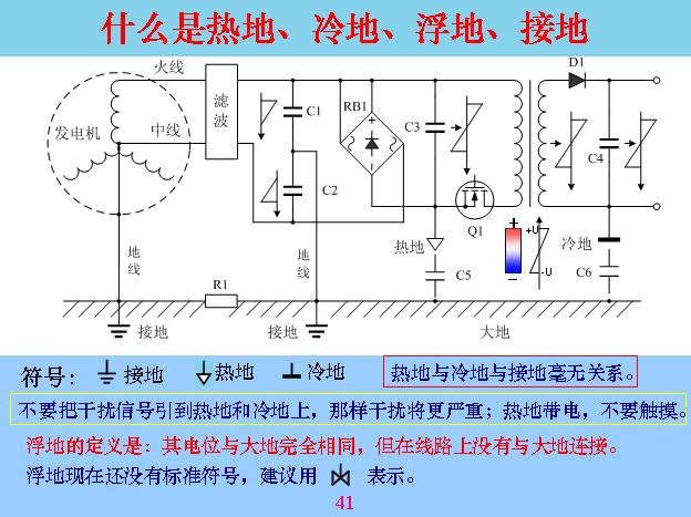 我們后面再講很具體的電路問題。很多人對地的概念不是很清楚,也不了解,現(xiàn)在很多人都把電路里面的公共關(guān)說成地,具體是不是?我們先介紹幾個概念。一般按照道理,最早地就是大地,后來地慢慢習(xí)慣用到設(shè)備里面,包括外殼、輸入線,比如說示波器或者信號線,與大地連在一起,有的不連,現(xiàn)在就變成了一個很模糊的概念,我們就把熱地、冷地、浮地、接地幾個概念簡單介紹一下。這個符號是比較標(biāo)準(zhǔn)的接地符號,就是接大地的,不管哪個設(shè)備接地都是這個符號。熱地國家還沒有標(biāo)準(zhǔn),大部分都習(xí)慣用這個箭頭作為熱地。冷地國家也沒有標(biāo)準(zhǔn),大家都接受是這樣的,這三個地基本上電工里面都有明確定義的,這個地就是接大地,熱地就是里面整流出來電源的某一端是公共端,人去摸它會帶電,會電死人,和前面的火線會產(chǎn)生回路電流,會電到人,所以這個叫做熱地。還有一個通過電子耦合以后沒有電的關(guān)聯(lián),只有磁場關(guān)聯(lián),你去量根本沒有回路,叫做冷地,手是可以摸的。但是你不要以為它是冷地就不帶電,實際上它還是帶電,為什么帶電?大家可能一下子不是很清楚,它帶的是靜電,相當(dāng)于極化帶電,就是線圈通過感應(yīng)以后,一頭帶負(fù)的,一頭帶正的。電容機(jī)也是,有一頭帶電,有一頭不帶電,這一點(diǎn)還是帶負(fù)電,不帶電的沒有跟電路連接,定位與大地一樣,所以叫做浮地。對應(yīng)的不是與大地相等,但沒有與大地連接,拿電表來量這一點(diǎn)與大地沒有電壓。浮地的信號現(xiàn)在還沒有,如果大家參考的話可以參加這個符號來用,這個地方電位等于零,當(dāng)兩邊發(fā)生變化就用這個來表,對電路分析有好處,特別是嚴(yán)重干擾的時候一定要把浮地找到,因為電位越高的地方電容越容易干擾,電位等于零,也就是浮地和電位是越低的地方干擾就越小。