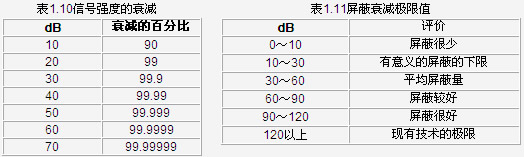 表1.10和表1.11給出了不同的屏蔽效能,吸收損耗的計算公式如下: