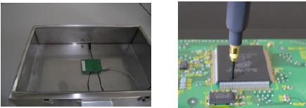表面掃描法通過測量集成電路表面電場和磁場的方法來描述集成電路的電磁發(fā)射特性。該方法的測量頻率范圍可達10MHz—3GHz,測量采用電場探頭或磁場探頭按一定順序掃過集成電路表面,由接收機將相應(yīng)的測量結(jié)果依次傳送給計算機處理。測試結(jié)果的準確性與電場或磁場探頭的特性和探頭定位裝置的精度有關(guān)。該方法可用于探測集成電路芯片上不同部位的電磁發(fā)射分布情況,適用于對集成電路的不同設(shè)計方案的電磁發(fā)射特性的比較。