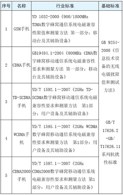 不同制式的手機電磁兼容測試時,選擇不同的行業標準,依據的基礎標準相同,見下表1。