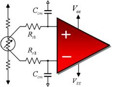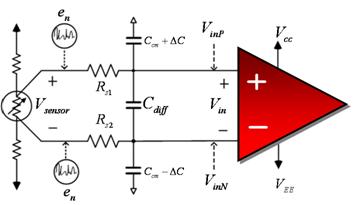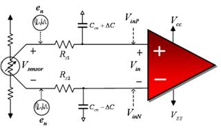 這種方法存在的問題是現貨電容都有一個 5% 到 10% 的典型容差,這就是說如果每條支線的 CCM 反向不匹配,總差動容差便會高達 20%。圖 3 更好地表示了這種電容不匹配,同時還顯示了電阻傳感器輸出端的共模噪聲輸入 (eN) 情況。