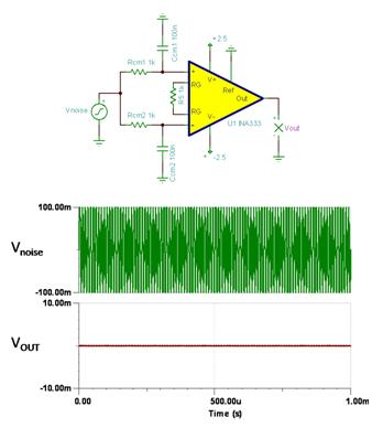 共模濾波器電容 (Ccm) 完全匹配時,噪聲幾乎被徹底消除。圖 2 顯示了 TINA SPICE 仿真的這一結果,其將一個 100 mVpp、100 kHz 的共模誤差信號注入到 INA333 輸入端。
