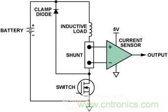 圖1所示為汽車應用環境中用于監控電磁閥或其它感性負載的常見配置。