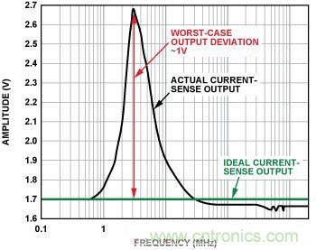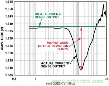 圖2所示為輸入在較寬頻率范圍內變化時電流傳感器的直流輸出與其理想值的偏差情況。從圖中可以看出,在1 MHz至20 MHz的頻率范圍內,偏差最為顯著(>0.1 V),且3 MHz時直流誤差達到最大值(1 V),這在放大器0 V至5 V的輸出電壓范圍中占據很大比例。