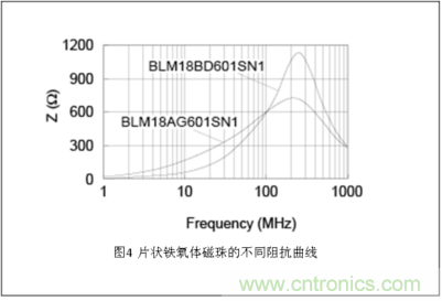 一般來說,片狀鐵氧體磁珠是以100MHz的阻抗值來決定其規格的。但與此同時, 也存在著諸多擁有相同阻抗值的不同產品,這是因為它們的曲線形狀各不相同。圖4所示的就是其中一例。BLM18AG601SN1與 BLM18BD601SN1都是100MHz阻抗值為600Ω的片狀鐵氧體磁珠,但從它們的阻抗波形可以看出,與BLM18AG601SN1較為平穩上升 的曲線相比,BLM18BD601SN1的曲線則呈急速上升的趨勢。