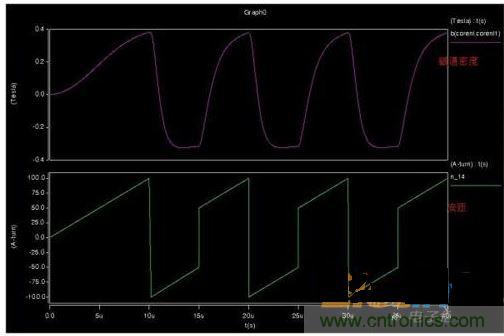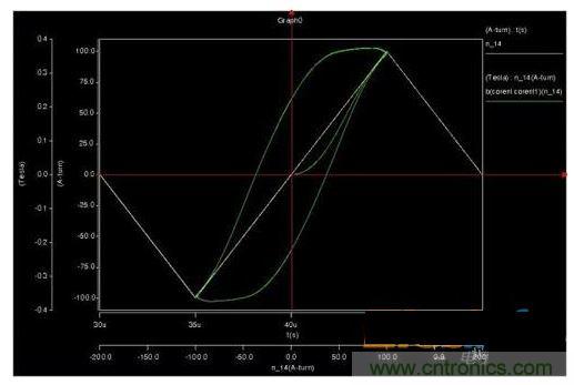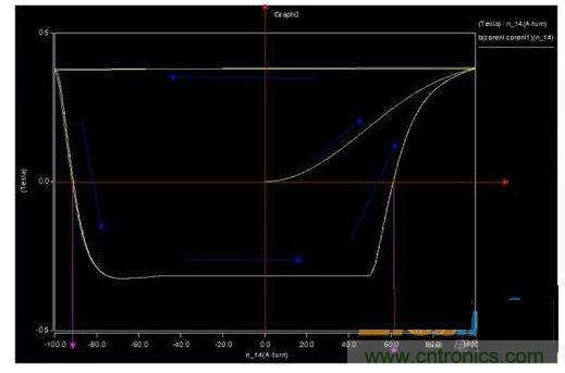 2、仿真CCM模式,磁滯回線上會(huì)出現(xiàn)兩個(gè)安匝跳變位置,但是磁通密度并不能跳變,而是通過(guò)下降來(lái)釋放能量。