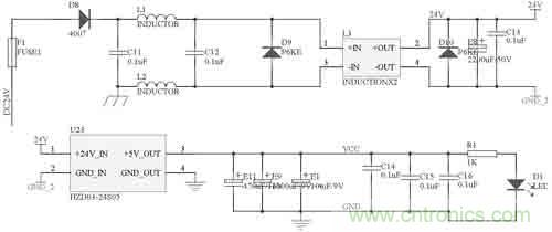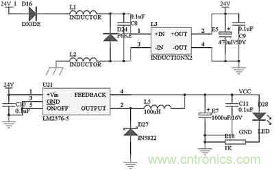 本控制模塊的電源電路如圖2所示。車載蓄電池—發電機的電源從24V_1處進入,二極管D16主要是防止電源的正負極被誤接反。電感L1、L2對電源進行濾波,和共模電感L3、電容C8配合,可以過濾掉電源中的尖峰脈沖。二極管D24 P6KE51A是脈沖干擾抑制器(TVS),它可以快速吸收超過額定電壓的尖峰脈沖,瞬時通過電流很大,最大功率可達500~1000W。電容E5和C9進一步對電源進行濾波。過濾干凈的電流通過開關電源芯片LM2576變換為系統使用的5V電源。電容E7和C11對輸出5V電源進行濾波,電阻R18和發光二極管D28指示當前是否有電。