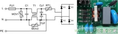 背景:以某型號的電源模塊為例,該模塊是周立功致遠電子為某客戶定制的電源模塊,輸入85VAC~350VAC,且EMC前級電路電路嵌入到模塊中。抗浪涌要求差模電壓3KV,共模電壓6KV。更換更大的保險絲后可承受6KV差模電壓。其前級原理圖及對應(yīng)實物圖如圖2所示