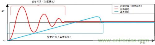 當旋轉變壓器的電機位置或輸出信號變化迅速時,穩(wěn)定時間是RDC控制系統(tǒng)的快速性能指標[2]。圖1顯示的一個是有階躍輸入變化(黑線)的RDC反饋控制系統(tǒng)的穩(wěn)定時間的例子。藍色信號顯示的是對電路的正常模式響應,紅色信號顯示的是加速模式過程中響應(角快速變化)。為了在快速變化的條件下追蹤到旋轉角,加速模式幫助控制回路很容易跟蹤到一個快速的旋轉角[4]。