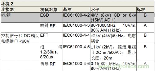 TI工程師測試IEC61800-3標準來獲取環(huán)境規(guī)范(表1)。該設計使用鎧裝連接器和鎧裝電纜(長度>30m)。標準的定義見表2。