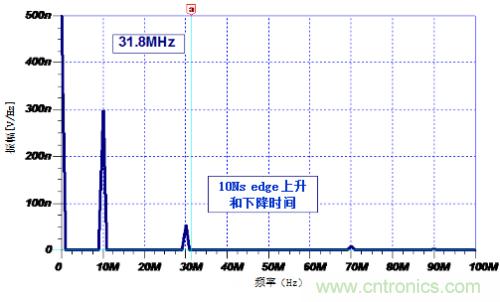 根據(jù)該公式,10nsEdge Rate對應的諧波頻率大約為31.8MHz。圖3顯示:最后一個重要的諧波頻率為30MHZ。同時,1ns的Edge Rate對應的諧波頻率318MHZ(圖2)。如果頻率范圍擴展到300MHZ以外,顯示的諧波仍很明顯,但卻在相關頻率上迅速變小。