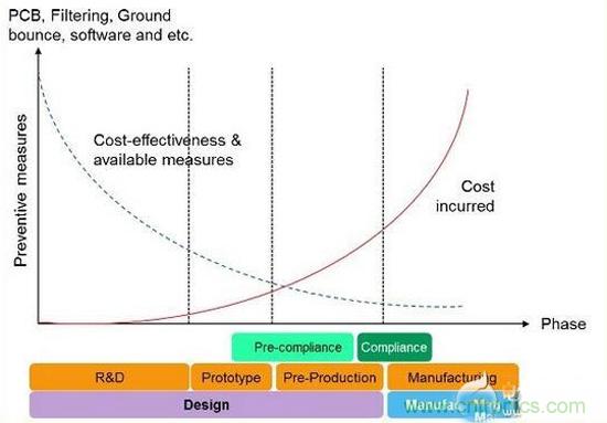 圖1:當(dāng)產(chǎn)品在開發(fā)階段一步步推進時,變更所承擔(dān)的潛在成本上升,清除EMI問題的可用措施逐步受到限制。
