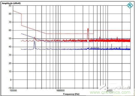 請看圖2所示的EMI測試報告,這份報告顯示大約90MHz處有個故障。