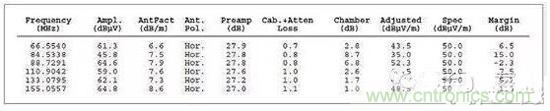 圖3是對應(yīng)的列表數(shù)據(jù)報告,其中詳細列出了測試頻率、測量得到的幅度、校準后的校正因子以及調(diào)整后的場強。然后將調(diào)整后的場強與下一欄中的指標進行比較,確定余量或超額量,顯示在最右欄。