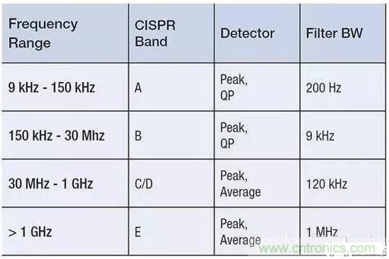 表1:CISPR測試要求根據(jù)不同頻率范圍而有所變化,并影響頻率分辨率。