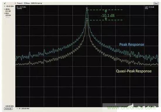 好消息是,峰值和準峰值掃描對預(yù)先一致性測試來說仍然是有用的。圖4給出了一個峰值和準峰值檢測的例子。圖中顯示了峰值檢測和準峰值檢測中都能看到的脈寬為8μs、重復(fù)率為10ms的信號。結(jié)果準峰值的檢測結(jié)果比峰值低了10.1dB。