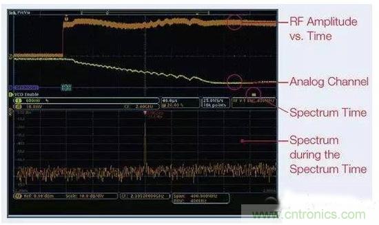 圖6:這張圖顯示了MDO提供的時間關(guān)聯(lián)觀察功能,圖中顯示了射頻幅度與時間的關(guān)系軌跡。