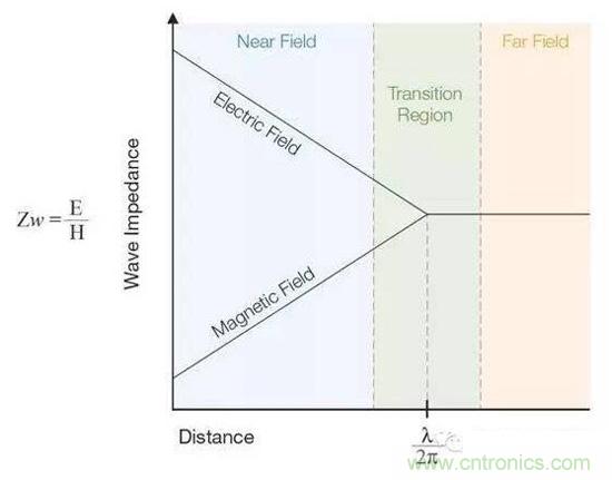 圖7:這張圖顯示了近場和遠場中的波阻行為以及兩者之間的過渡區(qū)。近場測量可用于EMI排查。