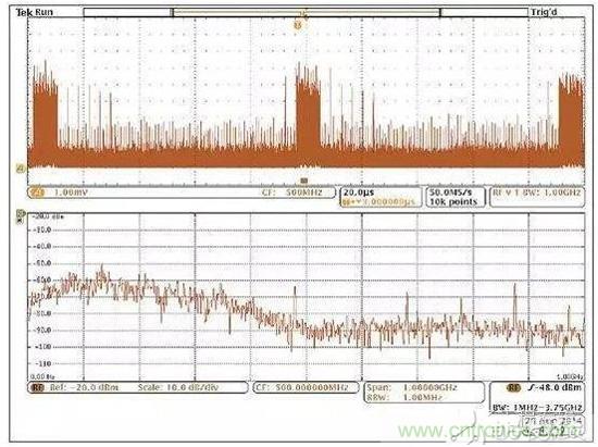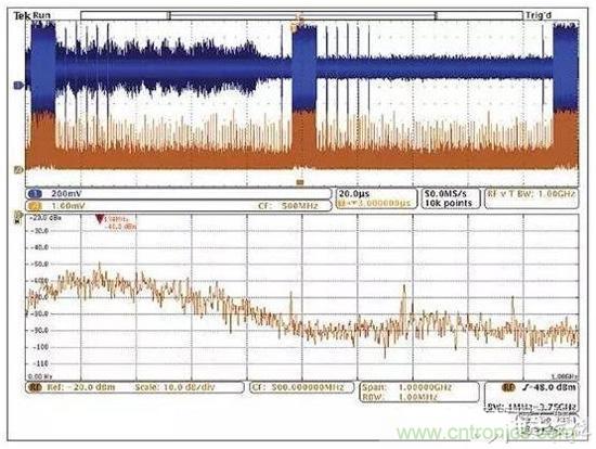然而,混合域示波器(MDO)的推出使情況有了改觀,它能提供同步的而且與時間相關(guān)聯(lián)的觀察和測量功能。如圖5所示的這種儀器能夠相當(dāng)容易地讓我們觀察哪個信號與哪個EMI事件同時發(fā)生,從而可以簡化EMI排查過程。