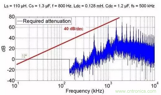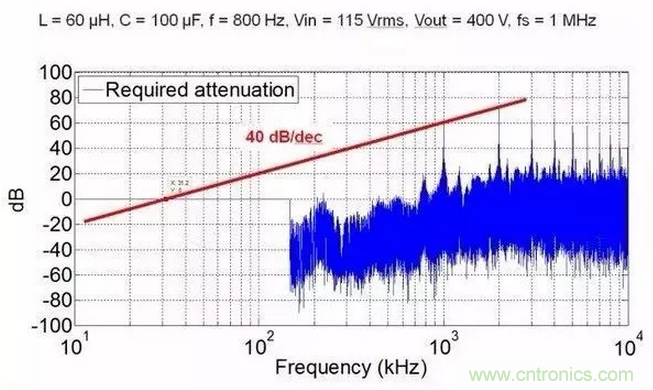 我知道很多人會說,怎么可能,di/dt和dv/dt都大了,怎么可能EMI濾波體積還小了。我想說一句,共模和差模濾波器的沒有區別,相同的截止頻率下,高頻的衰減更大!就算你高頻下共模噪聲越大,但是你的記住,這個頻率下LC濾波器的衰減更大,想想幅頻曲線吧。為了說明這個結論,我給出一些定量分析結果。這些EMI分析均基于AC/DC三相整流,拓撲為維也納整流。我分別給出了1Mhz和500Khz的共模噪聲,可以看出,500khz共模濾波器需要的截止頻率為19.2kHz,1MHz為31.2kHz。
