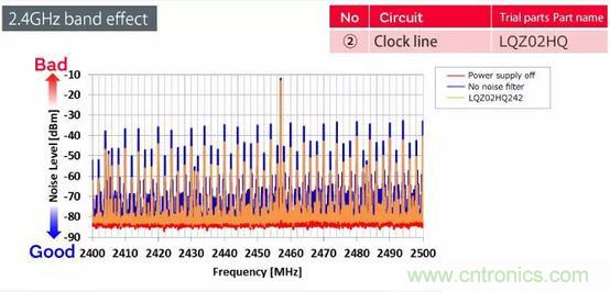 第一個區域是電源線,第二個區域是時鐘線。由于電源線由于切換而產生更高的諧波,并且時鐘信號的高次諧波延伸到2.4GHz頻帶,因此在藍牙信號中產生噪聲。濾波是抑制噪聲傳導的有效方法。