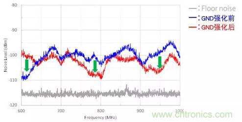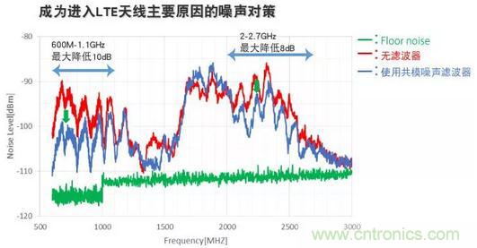 通過這些對(duì)策,如圖8所示,天線中進(jìn)入的噪聲最大可降低20dB,LTE的接收靈敏度取決于頻帶,改善了8dB。
