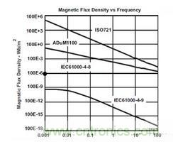下圖比較了ADI的ADuM1100(磁隔離)和TI 的ISO72x(電容式隔離)的磁場抗擾度,雖然兩個例子在限定磁場下都不太受磁場影響,但ISO72x對磁場抗擾度有更好的表現。