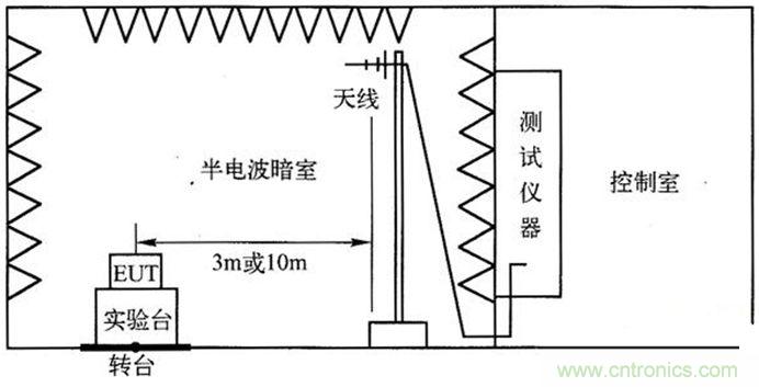 圖1所示是根據(jù)CISPR16、CISPR11、CISPR13、CISPR15、CISPR22及EN55022等標(biāo)準(zhǔn)要求的輻射發(fā)射測試布置圖,輻射發(fā)射測試時(shí),被測設(shè)備(EUT)置于半電波暗室內(nèi)部,在轉(zhuǎn)臺(tái)上旋轉(zhuǎn),在接收天線分別處于垂直極化和水平極化的情況下,找到最大的輻射點(diǎn)。輻射信號由接收天線接收后,通過電纜傳到半電波暗室外的接收機(jī)。