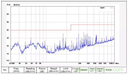 將晶振內(nèi)移,使其離PCB邊緣至少1cm以上的距離,并在PCB表層離晶振1cm的范圍內(nèi)敷銅,同時(shí)把表層的銅通過(guò)過(guò)孔與PCB地平面相連。經(jīng)過(guò)修改后的測(cè)試結(jié)果頻譜圖如下,從圖可以看出,輻射發(fā)射有了明顯改善。
