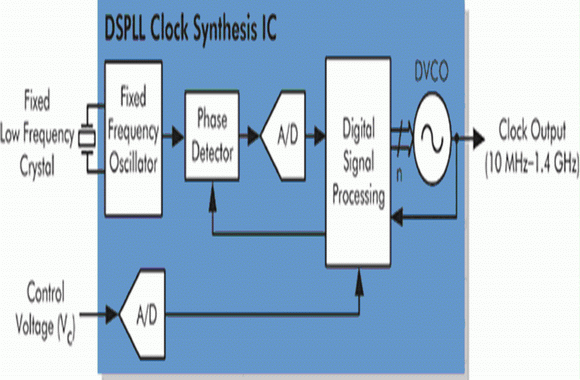 精密CMOS技術的進步提高了電路的速度和運算能力,廠商因此能以DSP為基礎發展出強大的頻率合成組件,并利用它們設計高頻率、低抖動的新型石英振蕩器和壓控石英振蕩器。這種把頻率合成組件與固定低頻率石英諧振器結合在一起的做法既可提供相當于傳統石英振蕩器或壓控石英振蕩器的功能,又可在使用者指定的多個頻率下操作。
