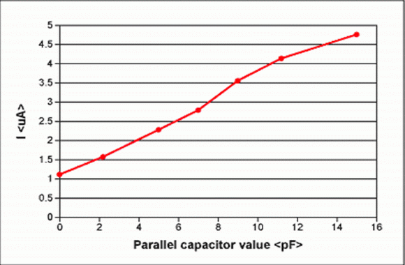 圖4. 晶體振蕩器電流與附加的并聯(lián)負(fù)載電容的關(guān)系