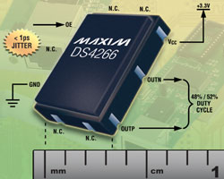 DS4266的尺寸比傳統的基于SAW的晶體振蕩器和三次泛音晶體振蕩器小55%,而且上述振蕩器通常無法達到優于48%/52%的占空比。DS4266是一款低噪聲、基于LC PLL的振蕩器,采用Maxim專有的SiGe工藝制造。該款晶振采用了基頻AT切晶體技術,無需諧波晶體即可實現高頻輸出。這種獨特的方法省去了三次泛音設計中常見的雜散工作模式,且整體穩定性優于基于SAW的振蕩器(> ±100ppm)。DS4266具有極低的老化系數(10年小于±7ppm),以及優異的、考慮了老化、電壓、溫度、負載和初始容差等因素的頻率穩定度(< ±50ppm)。